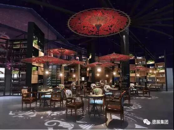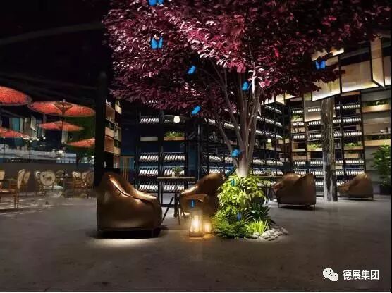 整個大廳以不同的藝術形式描繪著蝶戀花這個主題,陜西特有的剪紙藝術覆于在異型燈飾上通過燈光將其倒映在地面形成一幅幅美麗的蝴蝶圖形,一只只藍色的蝴蝶點綴在火紅的大樹四周,就好似一只只精靈在月光下翩翩起舞,使整個空間情景交融。