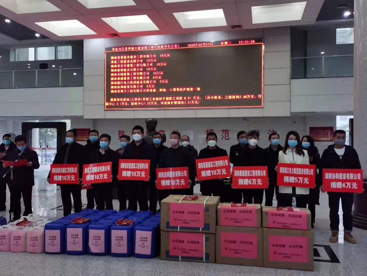 “病毒無情人有情”、“一方有難八方支援”!2020年2月11日,在婁底市住建局(人防辦)組織的市住建(人防)領域建筑業企業、房地產企業及局(辦)系統工會“抗擊疫情,勇擔責任”捐贈儀式上,公司總經理、法人代表胡勁代表婁底工程建設有限公司捐贈人民幣10萬元,為抗擊新冠病毒肺炎疫情盡企業的一份社會責任。公司董事長張愛慧參加了捐贈儀式。