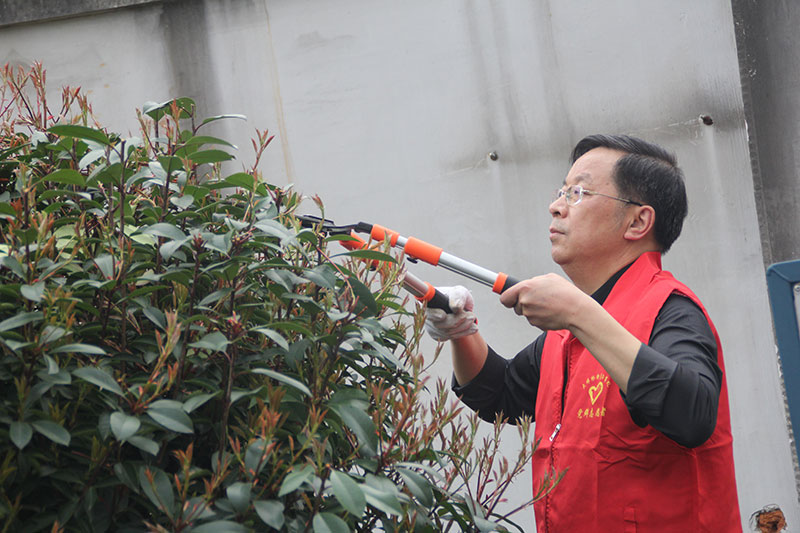 活動現場,志愿者們身穿紅馬甲化身“保潔”清潔公路、撿綠化帶里的垃圾;化身“園林技師”修剪綠植、施肥、澆水。